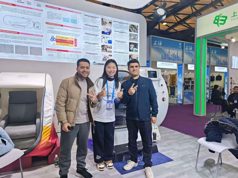 回顾这几天,上海宝邦Macy-Pan展位始终人头攒动、气氛热烈。来自全球各地的客商纷纷驻足,对家用高压氧舱表现出浓厚兴趣。现场咨询、体验的观众络绎不绝,展位内常常一座难求,等待体验的队伍排起长龙。